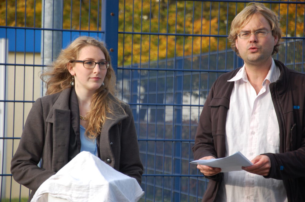 Die Grass Lifter sind eine Künstlergruppe die sich zur Aufgabe gemacht hat, das Gras, das über den NSU-Komplex wächst, auszugraben.