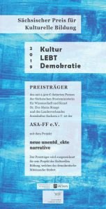 Das Programm „neue unentd_ckte narrative“ wurde mit dem sächsischen Preis für kulturelle Bildung Kultur.LEBT.Demokratie des Sächsischen Staatsministeriums für Wissenschaft und Kunst und des Landesverbandes Soziokultur Sachsen ausgezeichnet. Aus 72 Einreichungen würdigte die Jury vier Projekte (drei Hauptpreise i.H.v. 2.500€ & ein Sonderpreis i.Hv. 1.000€).