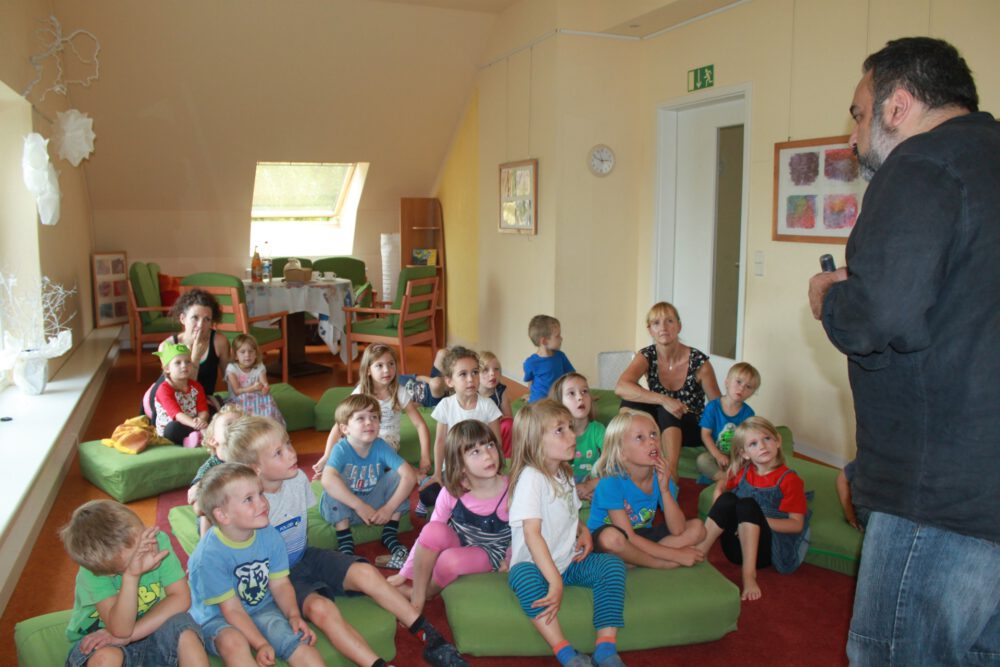 Ein großes weißes Blatt und ein schwarzer Stift reichen aus, um Kinder staunen zu lassen. Mit diesem Stift und großer Erzählfreude lässt Mehrdad Zaeri Geschichten entstehen. Die Kinder helfen ihm dabei. „Die Erde ist rund!“ ruft Friedrich und schon ist da ein großer Kreis auf dem weißen Papier. Auf einer Seite steht Mehrdads Haus im Iran, von dem er wegging, weil es dort Krieg gab. Mehrere Pfeile um den Kreis herum zeigen, wie er nach Deutschland kam, wo jetzt sein Haus steht. „ Das ist auf der ganz anderen Seite!“, wundert sich Anton. Kinder staunen auf unterschiedliche Weise. Phil und Ilian rufen ihre Meinung immer wieder begeistert aufspringend in die Runde, Paul hingegen sitzt mit geöffnetem Mund da und ist ganz still.