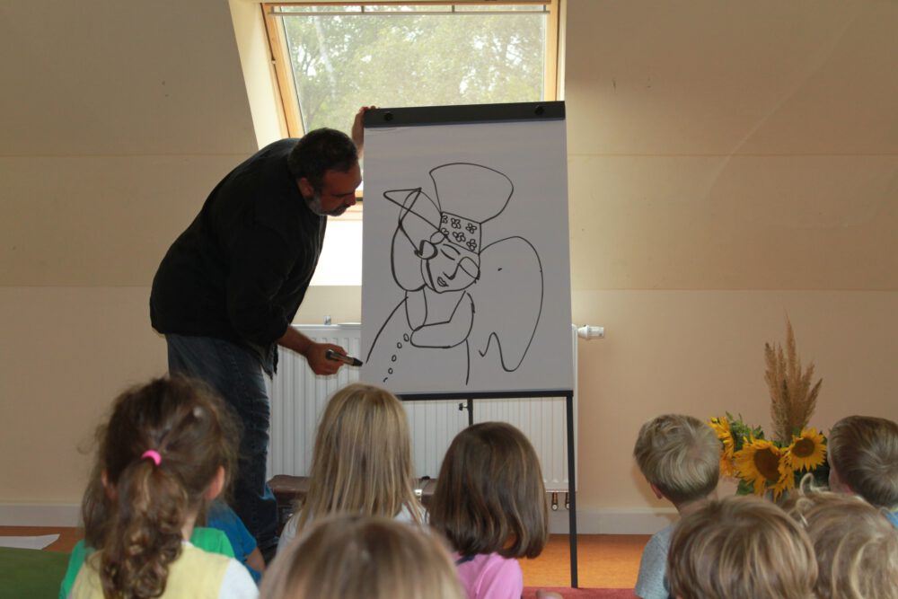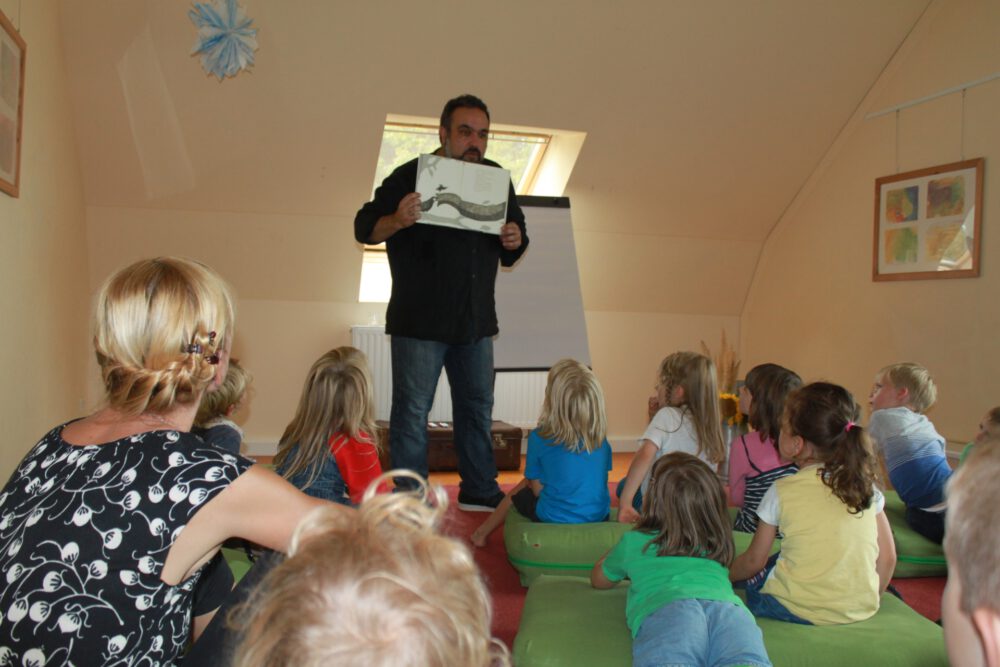 Mehrdad Zaeri erzählt und sein schwarzer Stift erzählt mit. Peyton schreibt ihren Namen auf das große weiße Blatt. Zwanzig Kinderaugenpaare verfolgen den Stift, der daraus ein Bild entstehen lässt. Ein Bild, das eine Geschichte ist, die Mehrdad erzählt. So wird aus „PEYTON“ eine Frau mit einem Papagei auf der Schulter. Neben der Papageienfrau entsteht ein Mann mit einer Katze auf dem Hut. Er schaut die Frau verliebt an. „Oh, aber Katzen jagen Vögel!“, weiß Charlotte. Ob das wohl gut geht? Vielleicht doch, denn es gibt besondere Freundschaften. Katze und Papagei könnten Freunde werden, wie im Buch „Ein großer Freund“. Dort sorgt sich die Krähenmutter um ihr Kind, weil es mit einem Elefanten befreundet ist. Mütter sorgen sich nun mal um ihre Kinder und manchmal haben sie recht, aber manchmal eben auch nicht. Mehrdad hat dieses Buch illustriert.